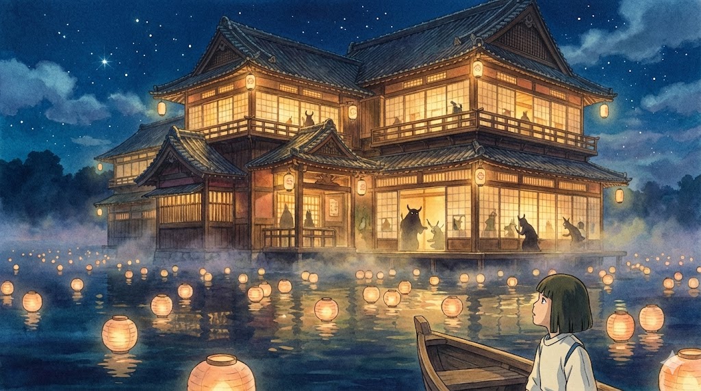 Lo stabilimento termale di Yubaba è un'architettura impossibile: mescola elementi di ryokan tradizionali dell'epoca Meiji, strutture di legno vernacolare, dettagli occidentali vittoriani e geometrie fantastiche che non appartengono ad alcuna tradizione storica reale. Miyazaki definì questa scelta come la ricerca di un senso di "nostalgia per un passato mai esistito" — un'emozione malinconica per qualcosa di perduto o mai raggiunto che il cinema Ghibli traduce in immagini con coerenza poetica eccezionale.