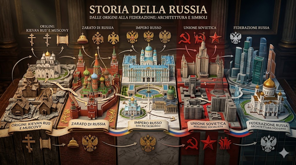 Mappa concettuale che unisce l'architettura imperiale russa con simboli sovietici e moderni