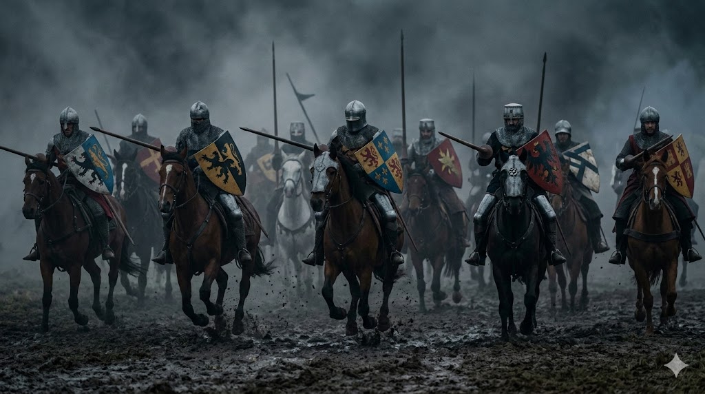 Cavalieri in armatura su destrieri da guerra nel Medioevo europeo