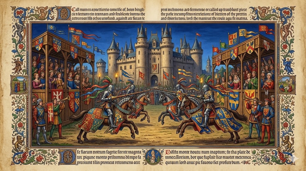 Illustrazione medievale di un torneo cavalleresco con stemmi araldici