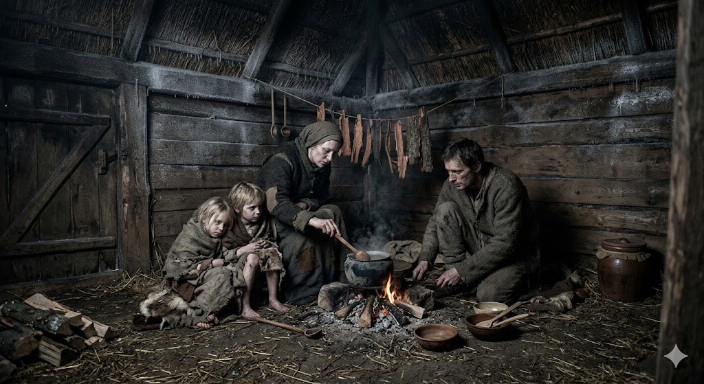 Famiglia contadina medievale intorno al fuoco in una capanna buia durante un inverno di carestia