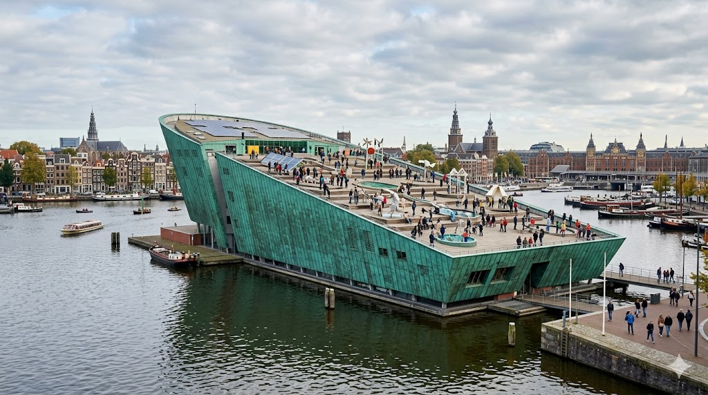 Il NEMO Science Museum di Amsterdam visto dal porto, con la caratteristica prua di nave rivestita di rame verde e il tetto terrazzato affollato di visitatori
